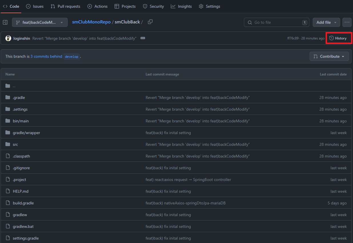 좌측상단에 보면 feat) backCodeModify가 아닌 22c5b5f3e로 온 것을 볼 수 있습니다.