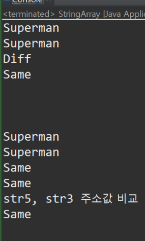 반면, 문자열 리터럴로 생성된 str3와 str4는 주소값과 데이터값 모두 같음을 확인할 수 있습니다.